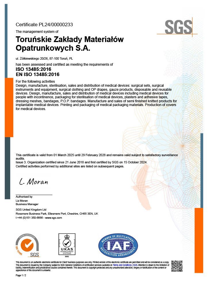In 1997, as the first company in Poland, we obtained a certificate confirming that we produce medical devices in accordance with the requirements of GMP (Good Manufacturing Practice) - the principles established by the WHO (World Health Organization).