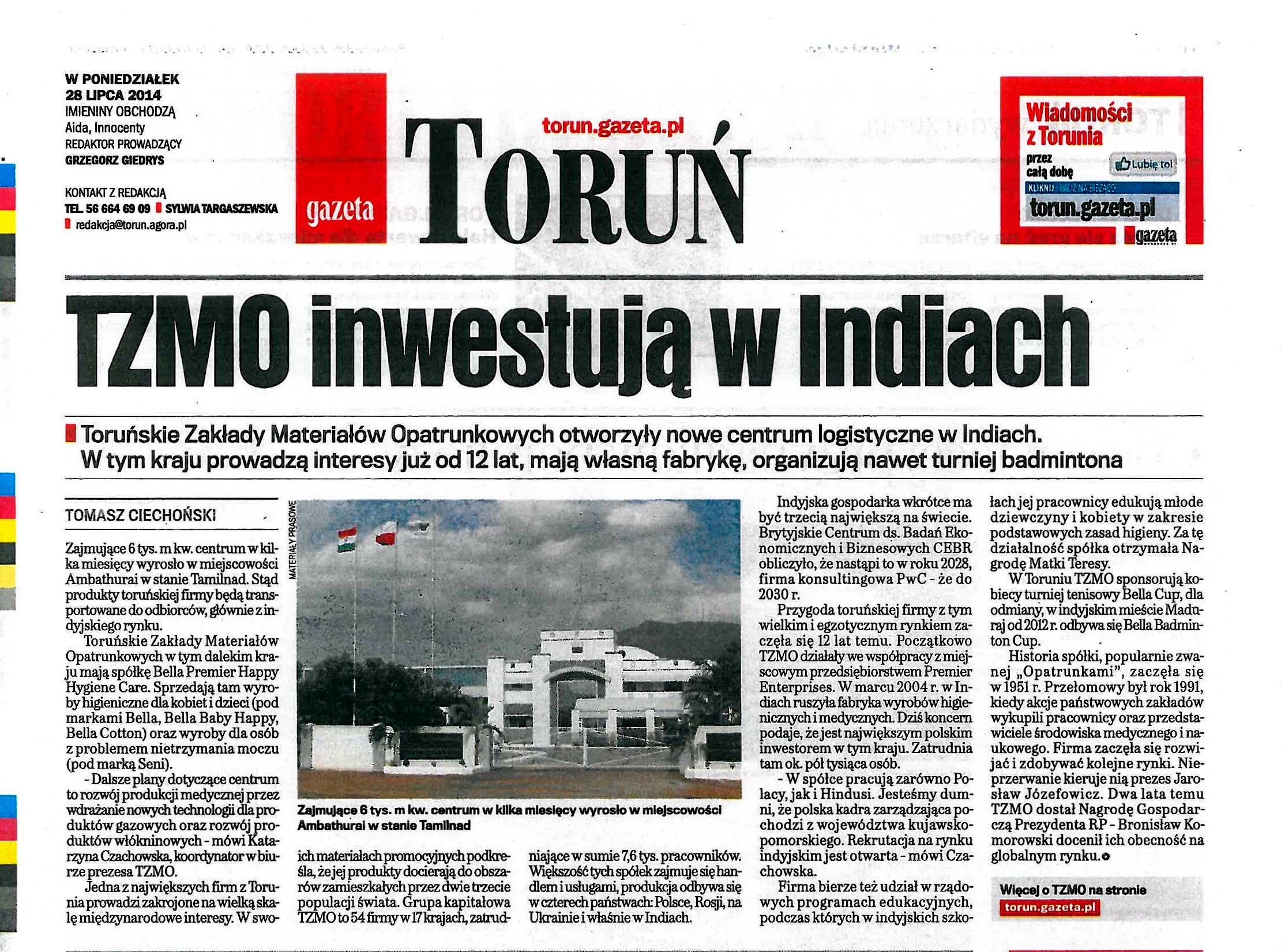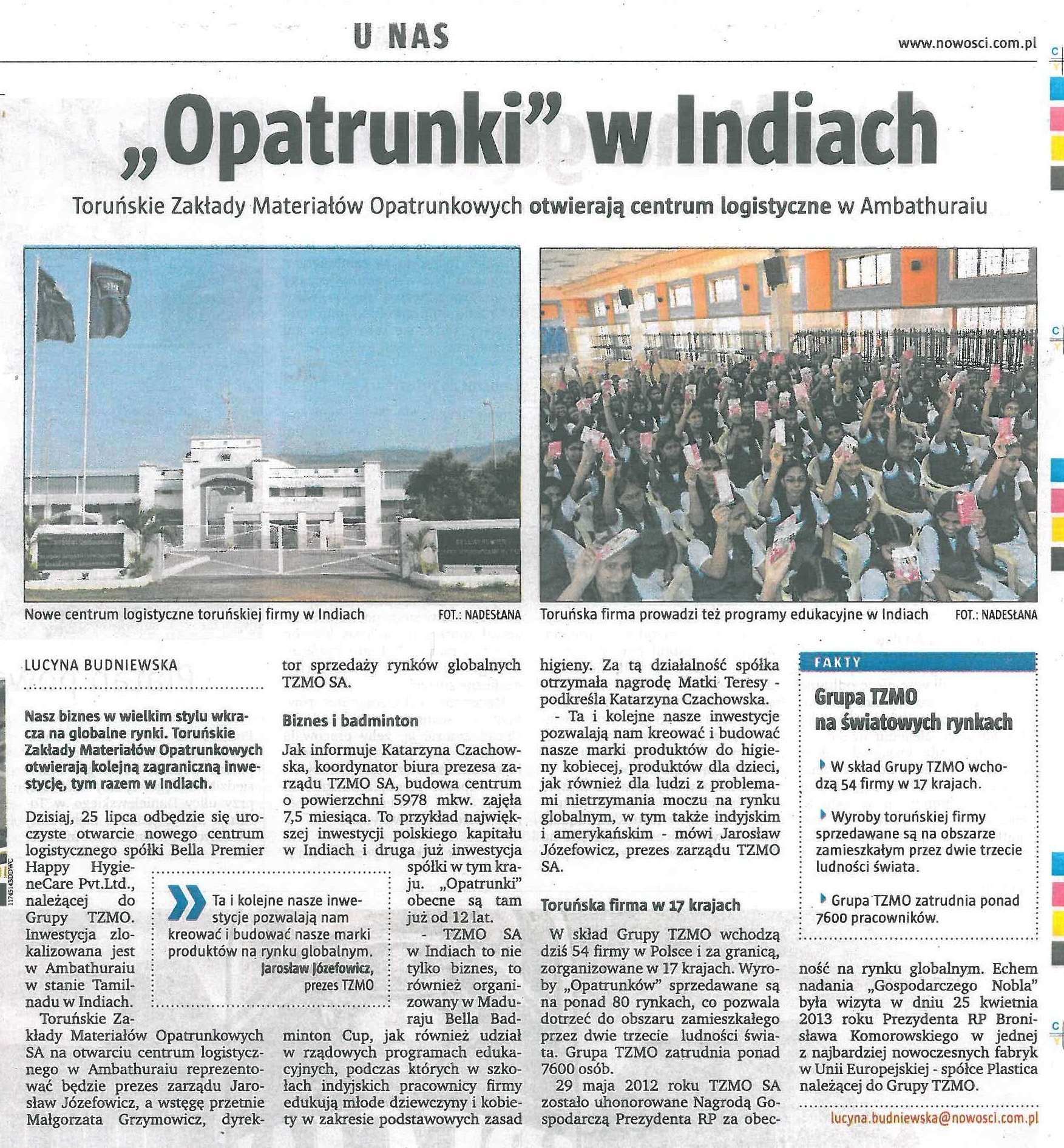 July 25, 2014 was held the grand opening of a new logistics center of the company BELLA PREMIER Happy HygieneCare Pvt.Ltd.  – member of the TZMO Group. Our new investement is located in Ambathurai - Tamilnadu in India. The construction of a logistics center with an area of ​​5978 m2 took 7.5 months. TZMO is an example of the biggest Polish capital investments in India. This is the second investment of the company in India. TZMO SA is present there for 12 years. TZMO in India is not just a business, it is also organized in Maduraju Bella Badminton Cup as well as participation in government educational programs in schools where Indian employees educate young girls and women in the field of basic hygiene. Behind this activity, the company was the Mother Teresa's award.