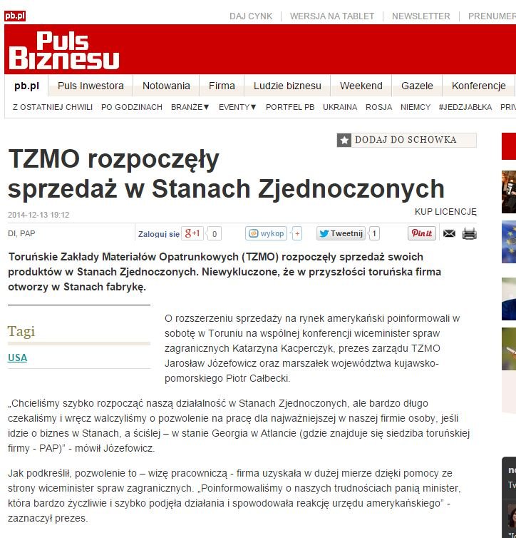 It is the most state of art and at the same time the only complex in Europe which brings together both production of hygienic and medical products as well as strategic semi-finished products and raw materials for their production. Next part of the visit was Hospital Matopat belonging to TZMO Group which started operation in 2001. While visiting the Office of Kujawsko-Pomorskie Voivodeship was held a press conference attended by Marshal Piotr Całbecki, Undersecretary Mrs. Kacperczyk nad President&CEO of TZMO SA Jarosław Józefowicz. Mr. Józefowicz said: „We wanted to start very quickly our business operations in US, but for a very long time we were forced to wait, even fight for a work permission for our No 1 person on the US market. Today we succeeded and thanks to that TZMO can be active from economic and business point of view on the American market. It is possible that in a quite near future we will establish a production plant in US. In the second part of 2015 we will know whether we will carry out this investment.” Mrs. Kacperczyk confirmed that in such matters it is extremely important to stay in touch with the Ministry and diplomatic posts in US. “ I am delighted that we were able to establish such a relation with Mr. President Józefowicz and TZMO company. Indeed, operations and work with American administration must be conducted on many levels and support from Polish administration can be helpful." – underlined Mrs. Kacperczyk. Hopes for support from Ministry of Foreign Affairs in the filed of foreign investments expressed also the Marshall Piotr Całbecki. He said that it is not often that Polish companies invest abroad. “More often we think about foreign countries when we plan to bring capital to Poland and in this case we have an opposite situation”.